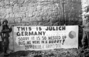 During the rest of the war the 29th Division clawed its way into western Germany. The men missed Hitler's Ardennes offensive, but by keeping up pressure on their own sector of the line freed other units to counterattack and defeat the Germans' last threat. In the spring the Blue and Grey finally broke through, capturing a number of cities and thousands of prisoners.