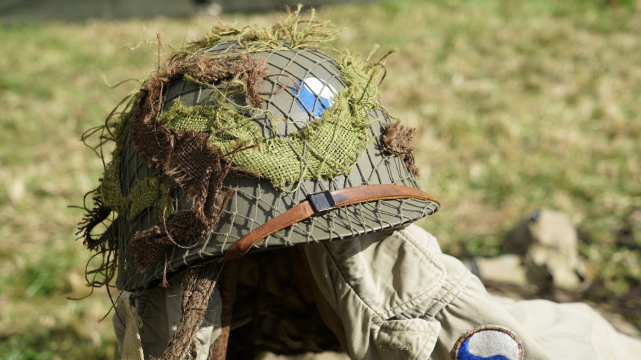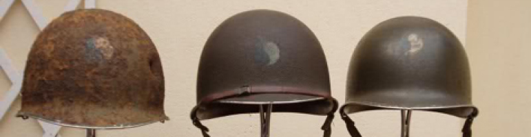 Later in June and onwards veteran accounts tell us that the 29th emblem would act as a bullseye for German snipers in the bocage, many GI’s started to scratch off the emblem or paint over it in an attempt to camouflage them-selves. The helmet emblems always re-appear again most likely due to General Gerhardt’s high standards of dress, examples of 29th helmets found in Brest have the emblems painted on them long after the fight for St Lo. Plain helmets are considered correct for a front line unit like C Company especially if you have a complete original helmet with original paint.