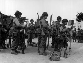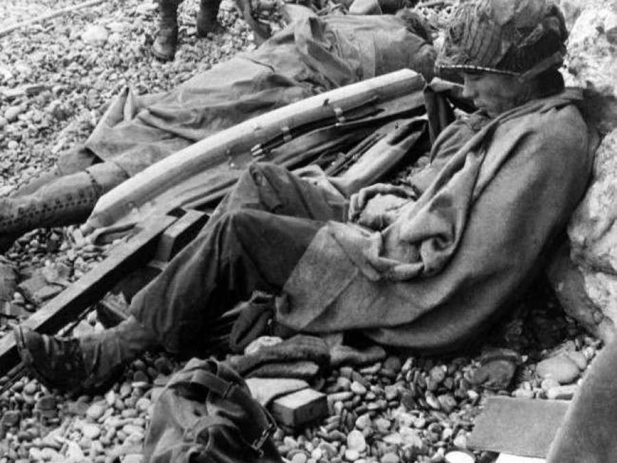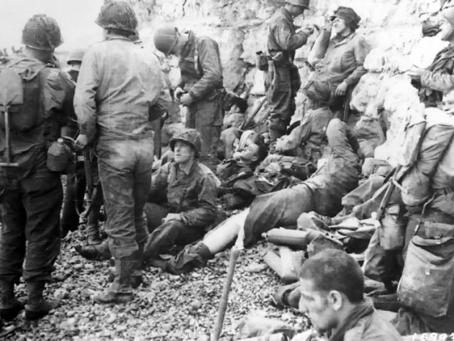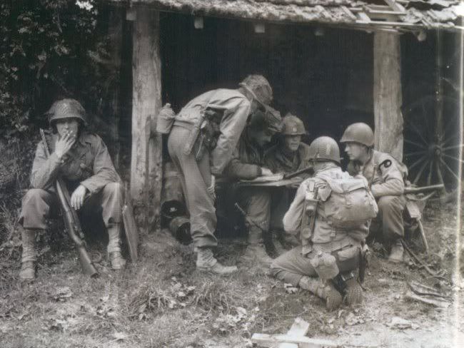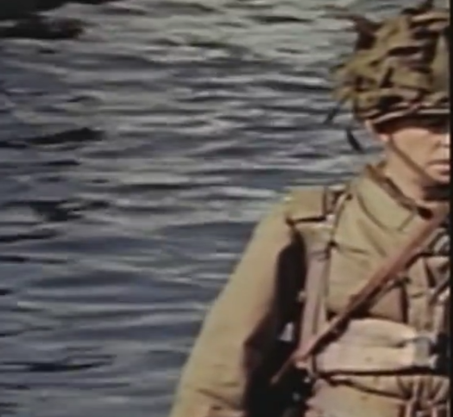 From images we have of the 29th training at the assault training centre we know that they wore scrim in their helmet nets. On closer research it is my opinion that the 116th 1st wave all wore scrim in their helmets. We can see this in 3 Portland photographs of the 116th, they are mostly all wearing assault vests of the dark OD variety, carrying the equipment of an assault section and all have their chin straps fastened. From the pictures of the 3rd battalion 116th GI’s at the cliff East of Les Moulins Draw we can see that they all have scrim in their helmets as well. We also have images of 29ers fighting in St Lo wearing helmet scrim however St Lo was taken by the 115th 116th and 175th so we cannot say for sure. From barn finds and dug up helmets it has been established that the colour of scrim used in 29th helmets was the lighter British "apple green" and a dark brown. This scrim is found on a lot of original British helmets and it is likely that the 29th sourced their helmet scrim from the same supply.
