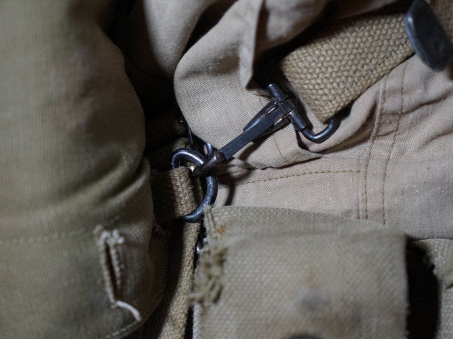 You can now fix the meat can pouch by feeding the straps through the D loops. As with reproduction haversacks the same apples to meat can pouches, reproduction pouches are of a similar strange colour unless purchased from a reputable source. In most cases a decent reproduction pouch can cost the same if not more than an original. Always talk to your NCO’s if you are unsure of an item you are thinking of purchasing.