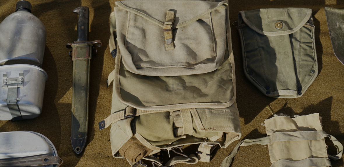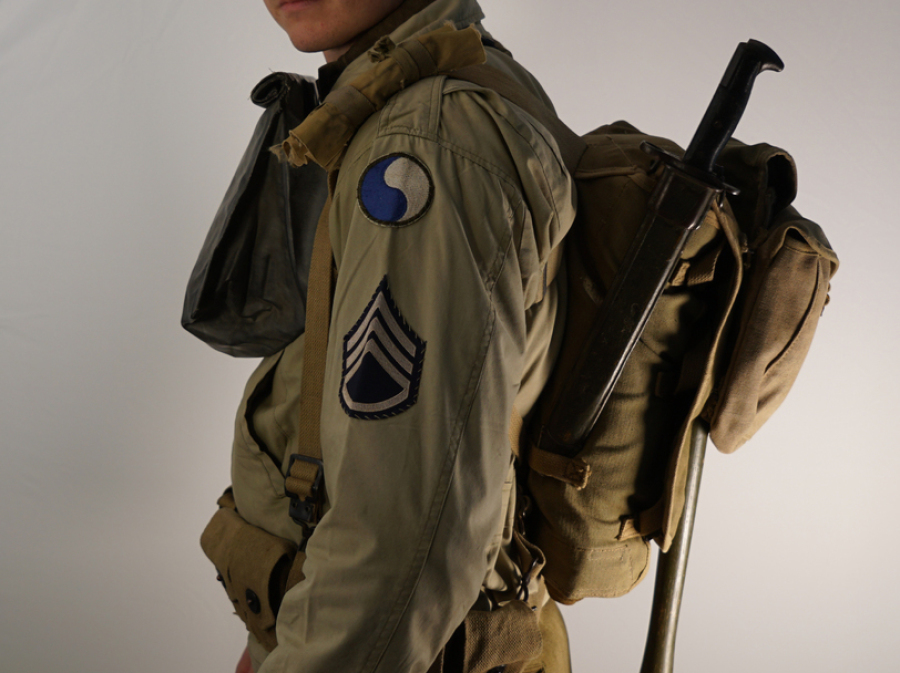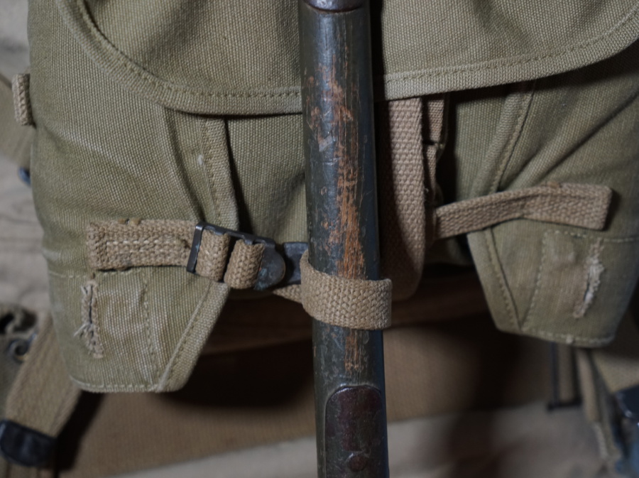 Once your pack is assembled you can fix your bayonet and shovel, if the show is a D-Day impression you can add the first aid packet to the top left of your haversack strap. We fix the packet to the left shoulder so it doesn’t restrict the position and hold of the rifle when aiming.
