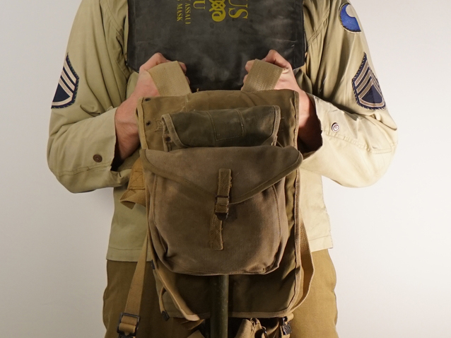 The M1928 Haversack was the standard field pack issued to GI’s of the 29th division during the war, this pack had seen service since ww1 and did not go through any dramatic changes in its life time. Original haversacks are quite easy to come by at markets and shows with prices ranging depending on wear and maker marks, for instance British made equipment can sometimes fetch a higher price. Haversacks are not the easiest packs to open and close when you’re in a hurry, however they were used up until 1945 by the 29th Division.