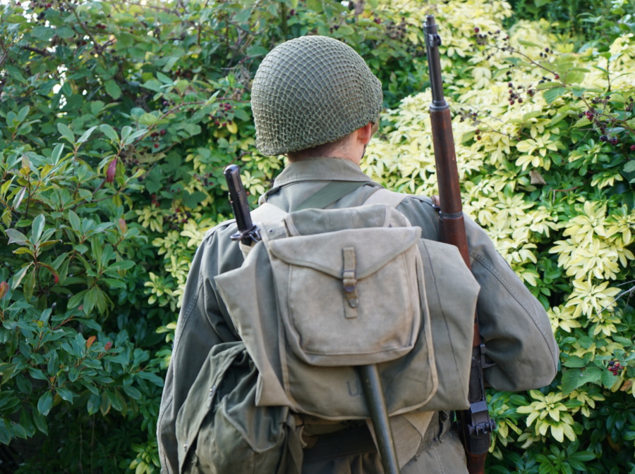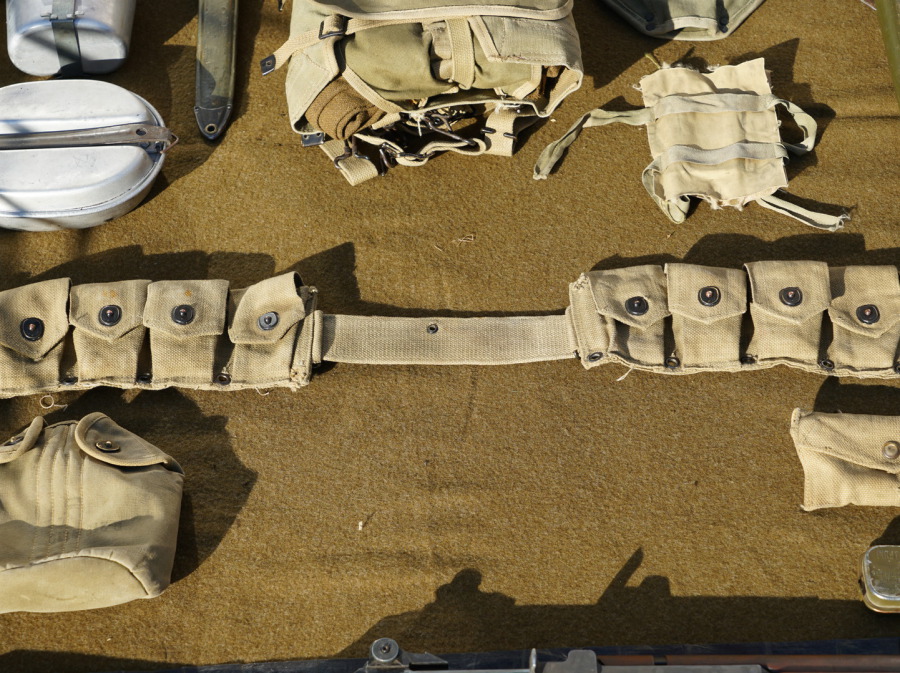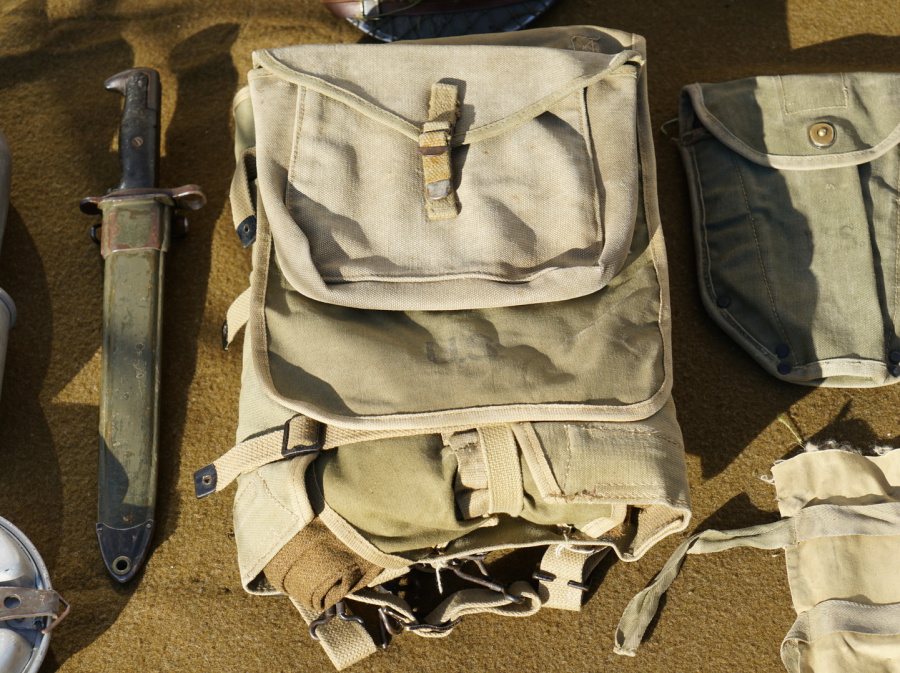 The haversack was used during WW1 and modified in 1928 where it was then issued untill 1945. The bayonet and entrenching tool can be fixed to the haversack as well as the meat can pouch which would contain the mess tin or rations. Inside the pack would contain a shelter half, blanket, wash roll and socks as well as a few other personal items. The pack could be extended by the use of a pack tail attachment which was used during long marches in the US however we have no evidence of the 29th using the tails in the ETO.