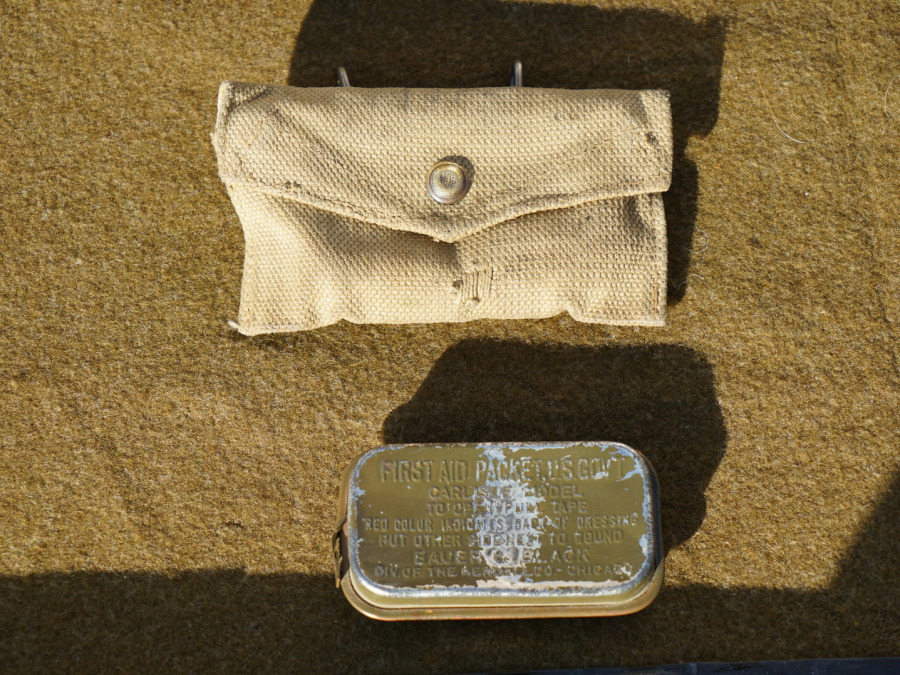 The first aid pouch was issued to all 29ers. The Carlisle tin contained a bandage and a packet containing sulphanilamide crystals (to be sprinkled around the wound). The tins were mostly made from tin, but again to save on metals for the war effort other materials were used such as plastic or waxed carboard.